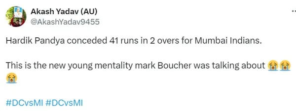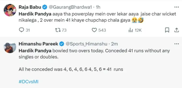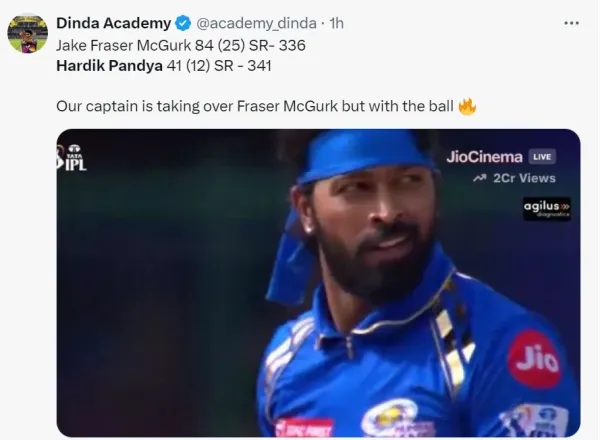 Jake Fraser-McGurk reached his fifty in an astonishing 15 balls and went on to score 84 off just 27 balls, including six sixes and 11 fours. His exceptional innings came to an end when he was dismissed by Chawla in the 8th over. Fraser-McGurk's knock propelled Delhi Capitals to a commanding position against Hardik Pandya's Mumbai Indians in Delhi. Witness Hardik Pandya being taken this brutally for runs, fans on social media started trolling him left, right, and center. Check out the reactions of fans:.@delhicapitals' Flying Powerplay 🤩 Fraser-McGurk increases the temperature with some explosive stroke play 🔥 Watch the match LIVE on @JioCinema and @StarSportsIndia 💻📱#TATAIPL | #DCvMI pic.twitter.com/e2VdyReaPu