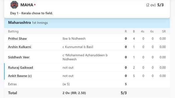 Maharashtra vs Kerala: Ranji Trophy has started, where there was an uproar in the very first match of Maharashtra. Maharashtra team is playing against Kerala. In this match being played in Thiruvananthapuram, Kerala won the toss and put Maharashtra to bat first. This decision of Kerala paid off. Because Maharashtra's batting seemed to be derailing even before it got going. You can guess about his poor batting from the fact that even after 2 overs, the accounts of 5 batsmen were not opened.