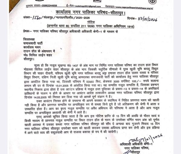 An ultimatum of 15 days has been given to all the occupants as a final warning. He has been directed to remove the possession himself and hand over the property to Municipal Council Sitapur within this period. Failing to do so, the municipality will forcefully vacate the building and the expenses incurred in this process will be recovered from them as land revenue dues. These orders have been issued by the Executive Officer Category-1, Municipal Council Sitapur.